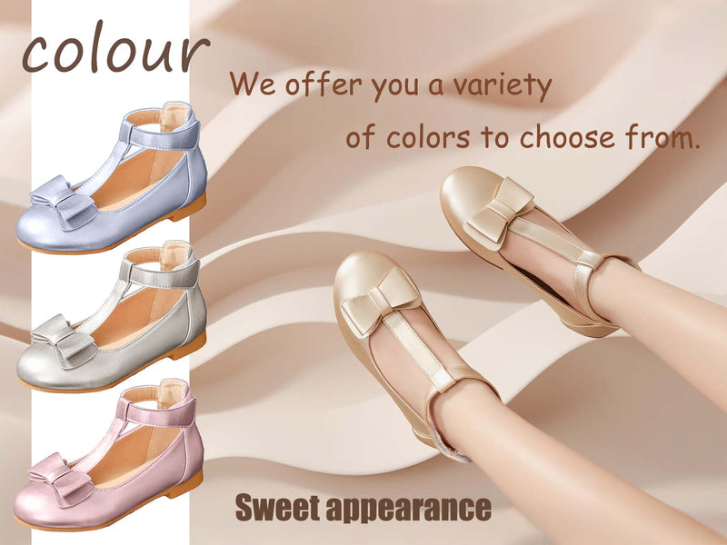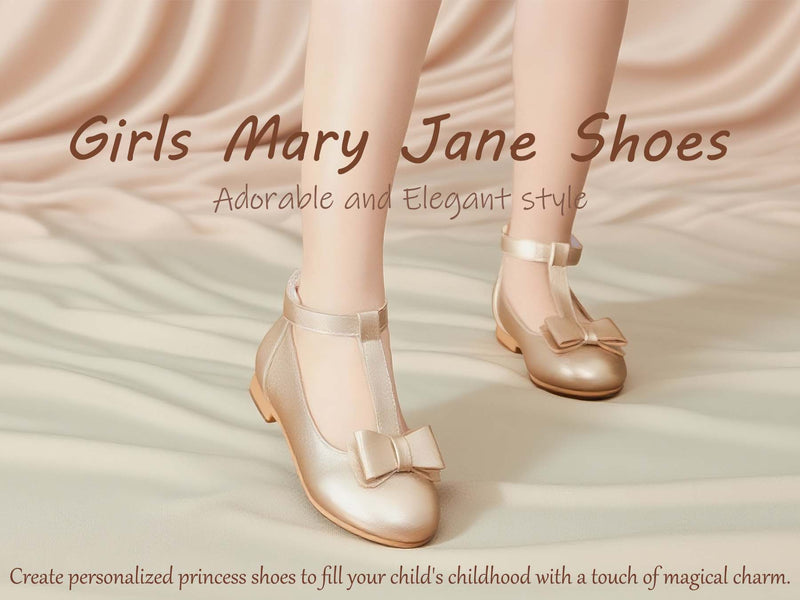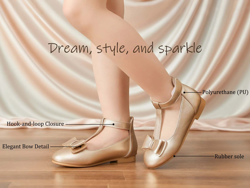 Girls Princess Mary Jane Dress Shoes with T-Strap and Bow – Gold Leather Toddler/Little Kids Party Wedding Performance Shoes with Buckle Closure