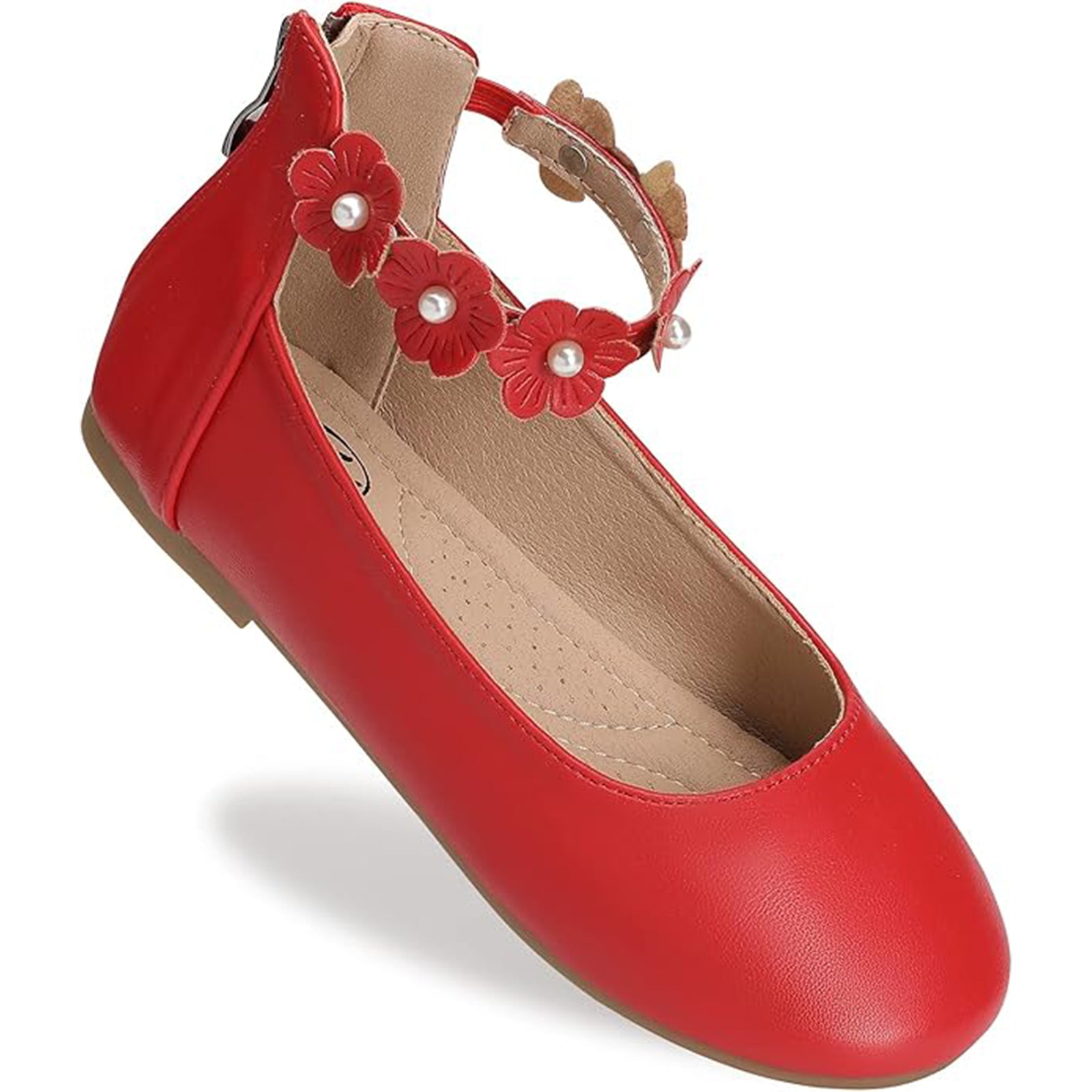 Girls Mary Jane Dress Shoes with Ankle Flower Strap and Pearls – Ivory Leather Toddler/Little Kids Party Wedding Performance Shoes