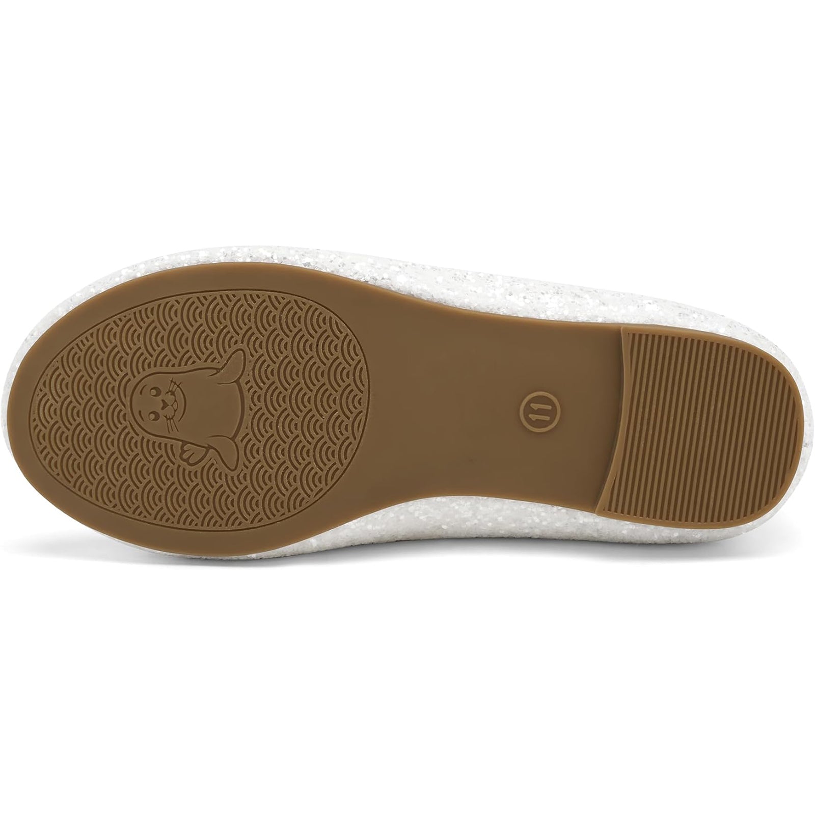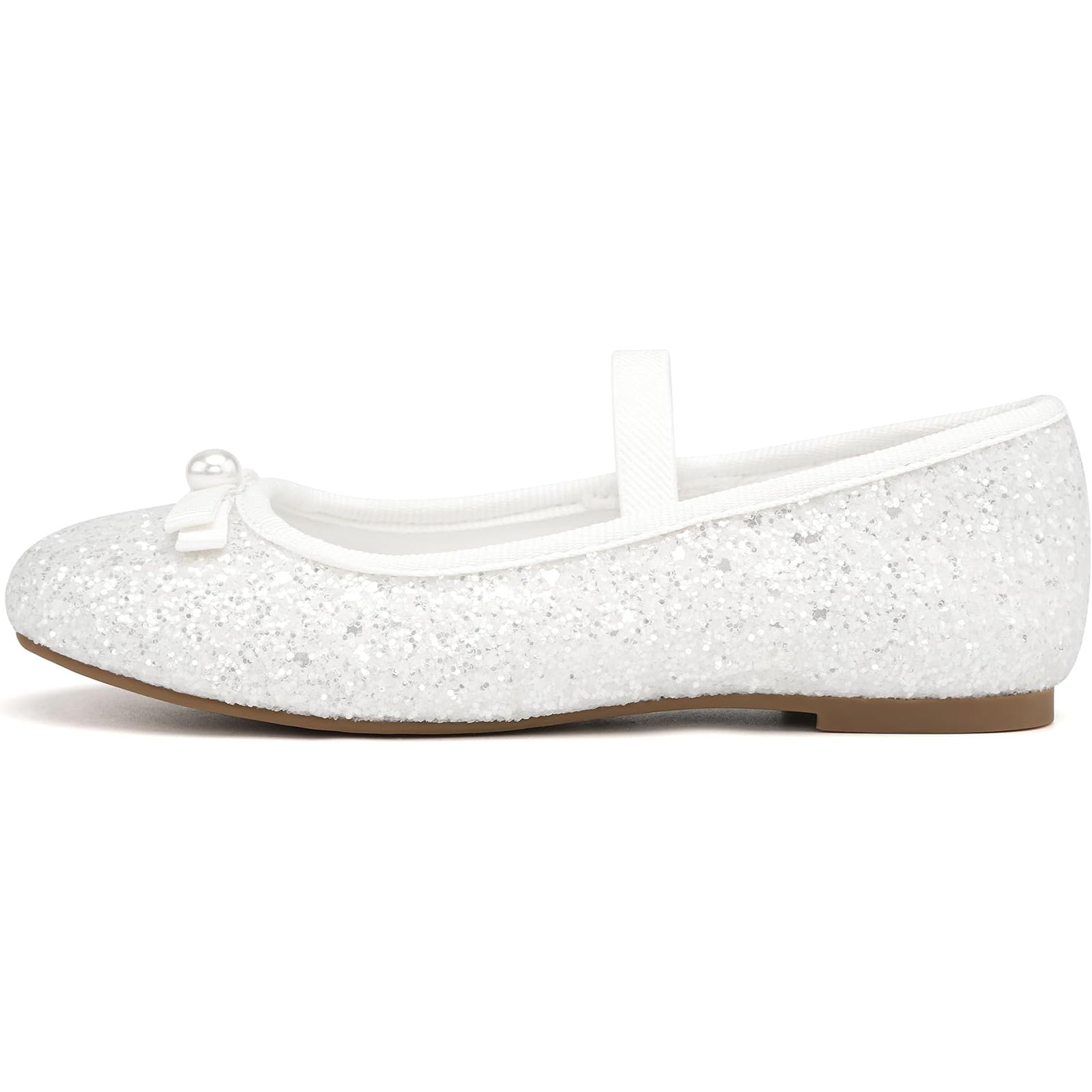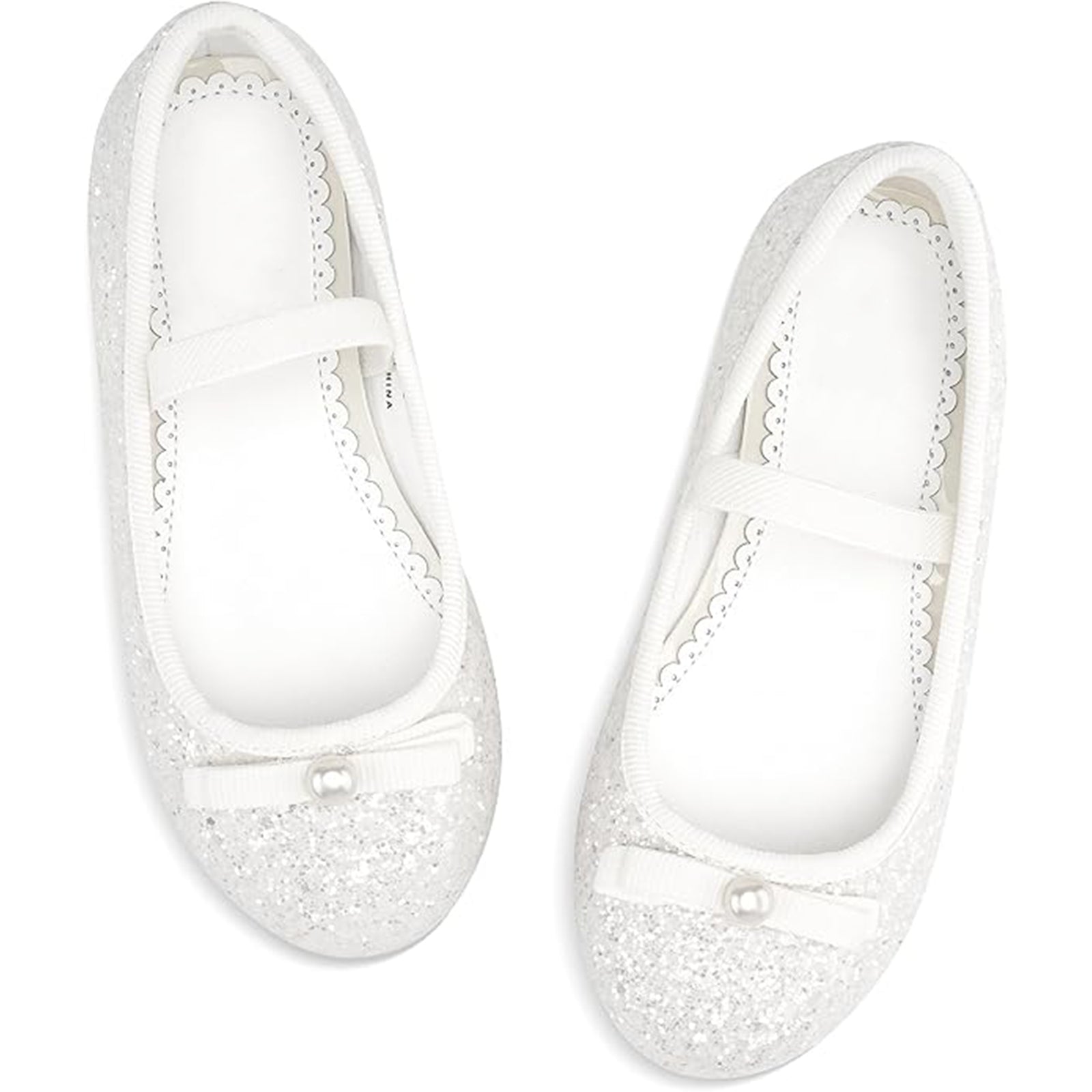 Girls Mary Jane Party Shoes – White Glitter Dress Flats with Pearl Bow, Sparkly Princess Shoes with Buckle Strap for Toddler & Little Kids