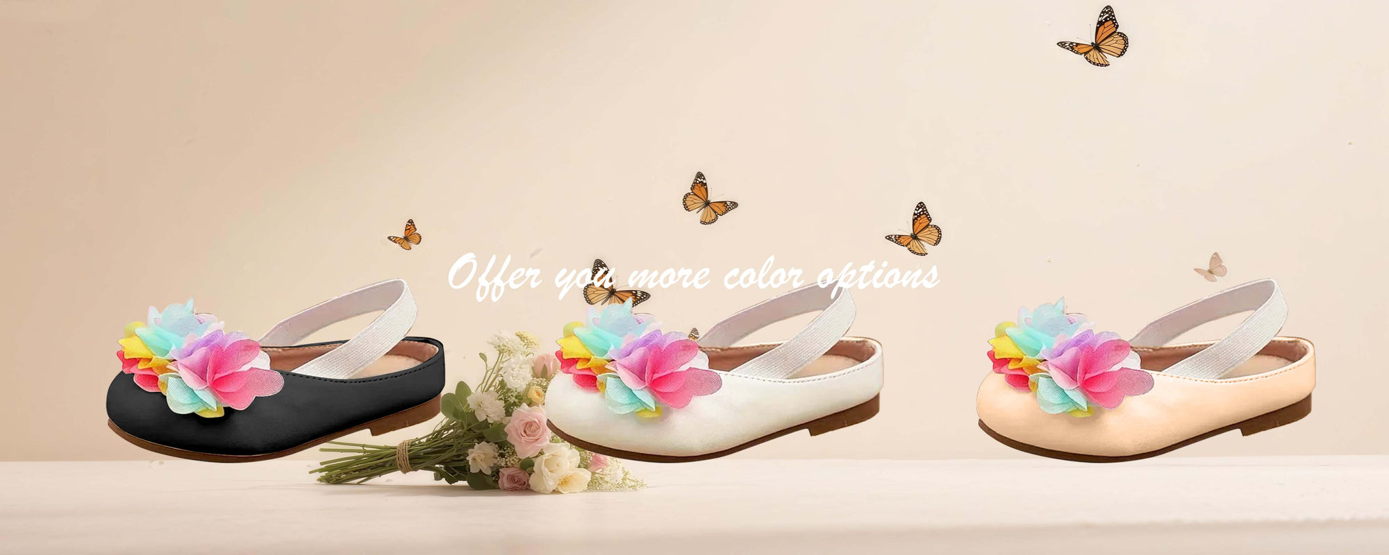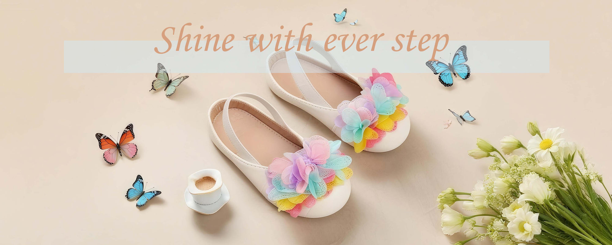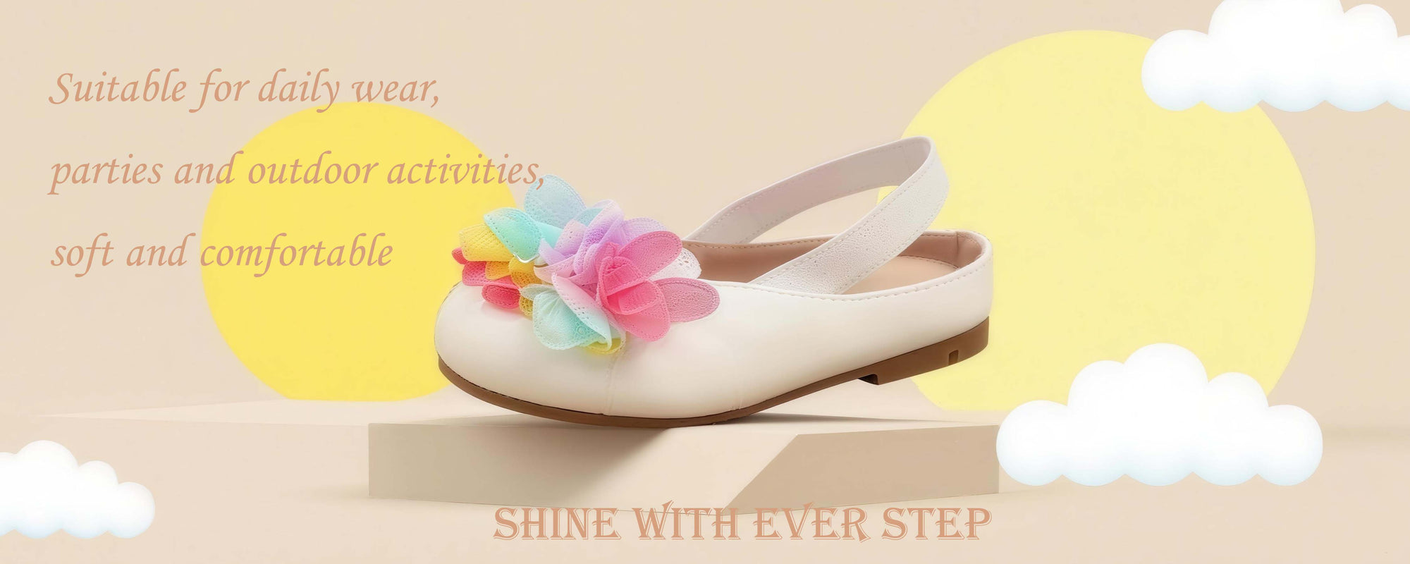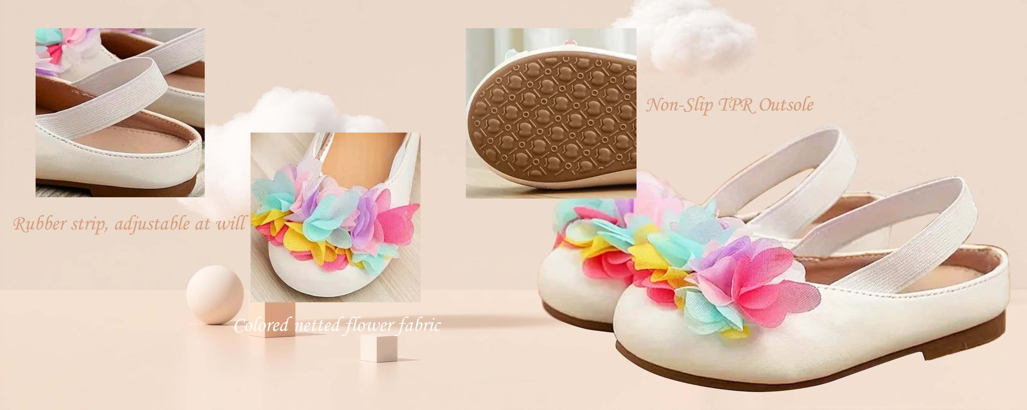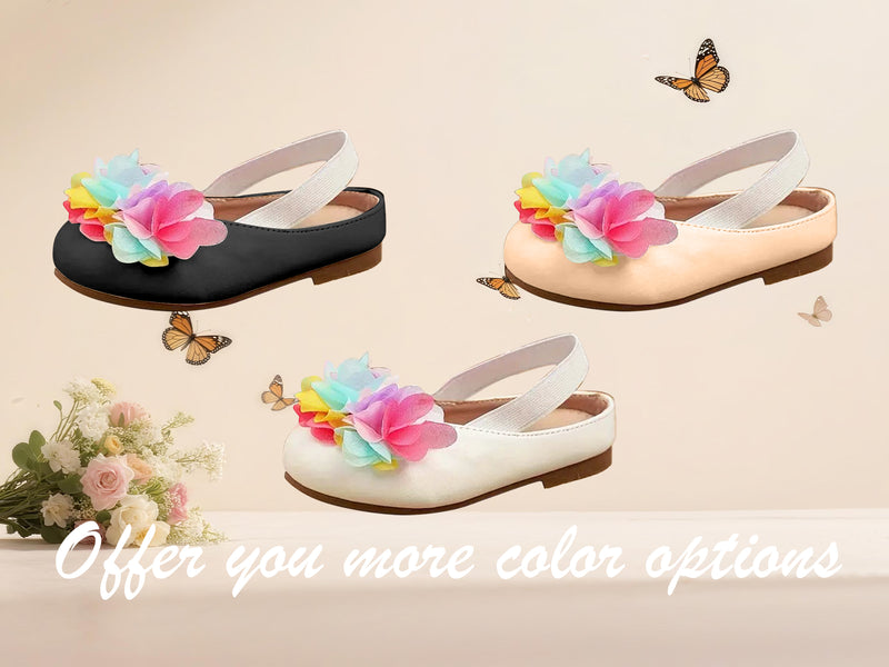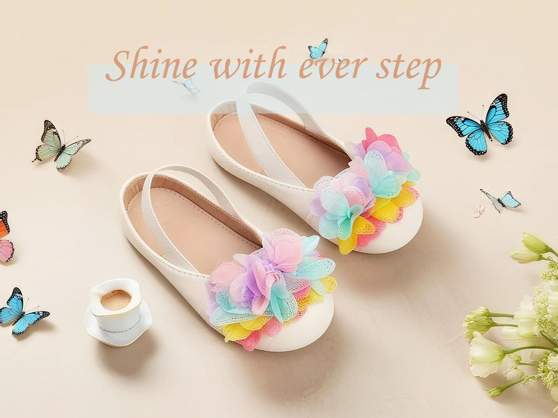 Colorful Flower Accent – Pink, yellow, and blue tulle flowers on the toe add a lively and playful charm.