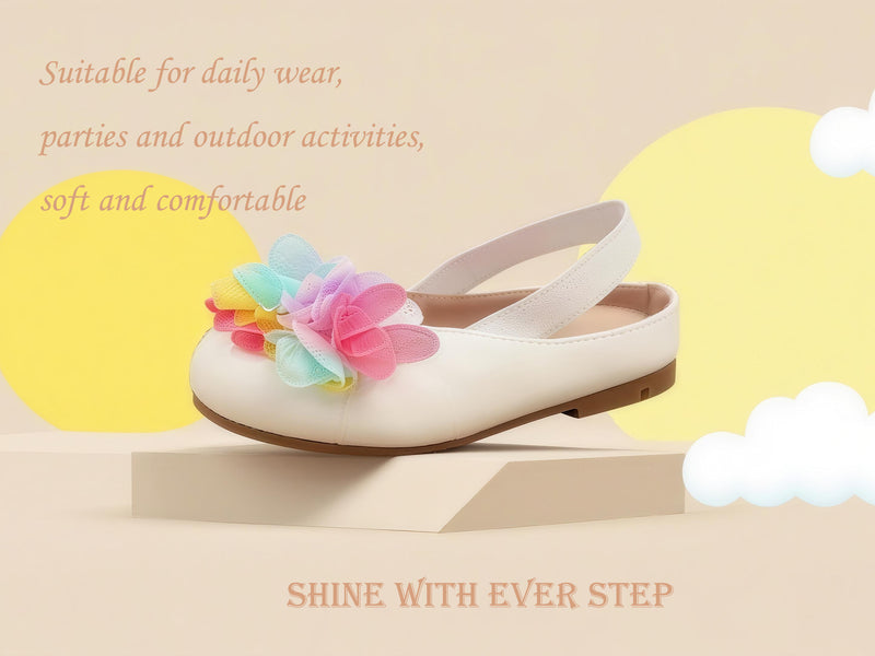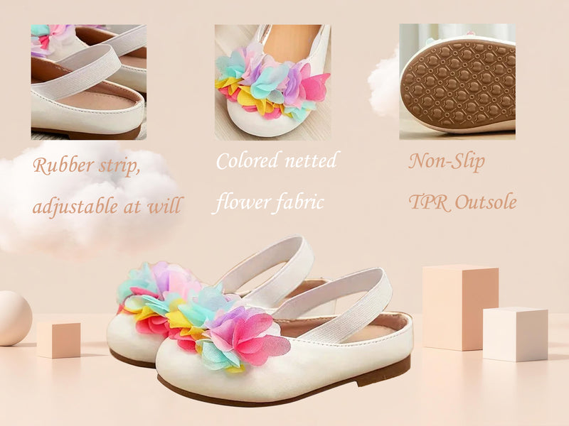 Girls Mary Jane Flats – Ivory Dress Shoes with Colorful Tulle Flower Decoration, Single Strap Princess Shoes for Toddler & Little Kids