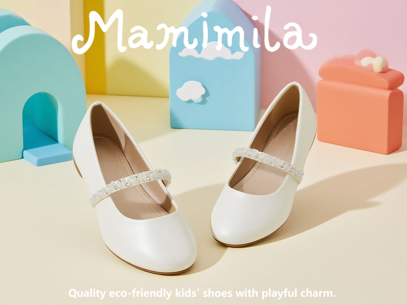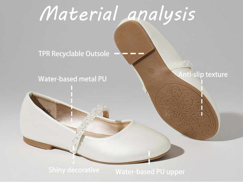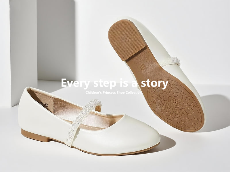 Girls Mary Jane Shoes – White Dress Flats with Pearl & Crystal Strap, Elegant Princess Shoes for Weddings, Parties, and Formal Occasions