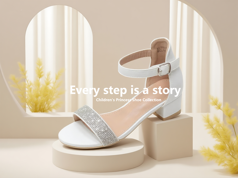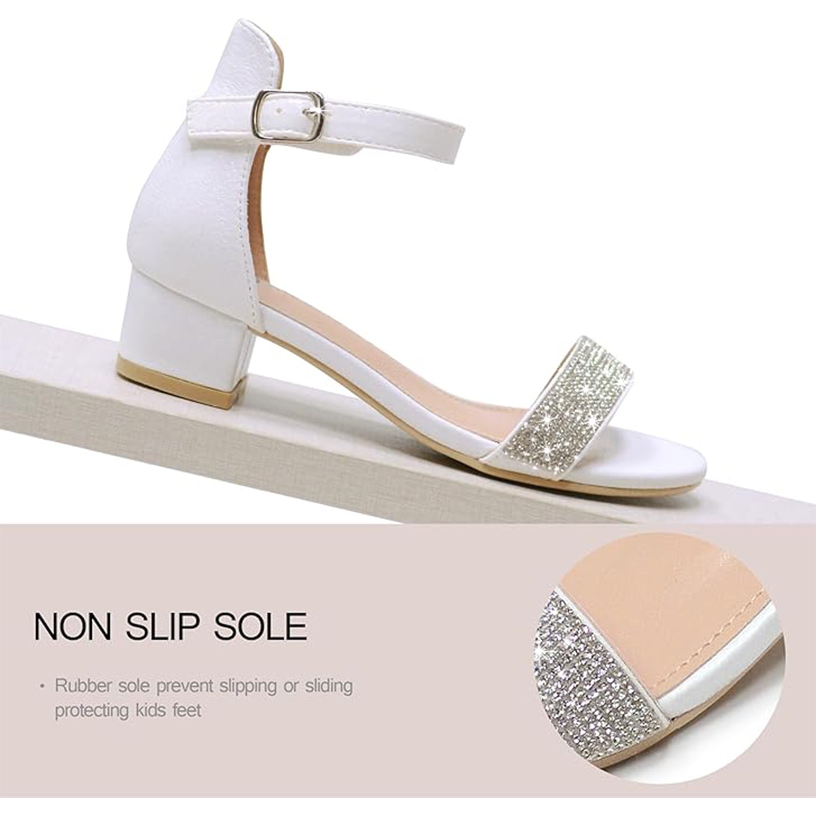 Girls White Heeled Sandals – Sparkly Rhinestone Dress Shoes with Buckle Strap, Chunky Heel Party Shoes for Weddings, Birthdays, Princess Outfits