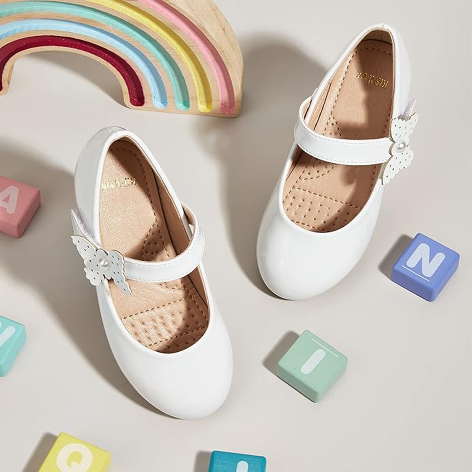 Girls Mary Jane Shoes – White Patent Leather Dress Shoes with Butterfly Pearl Decoration, Low Heel Princess Flats for Party, Daily Wear