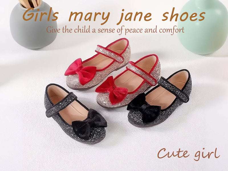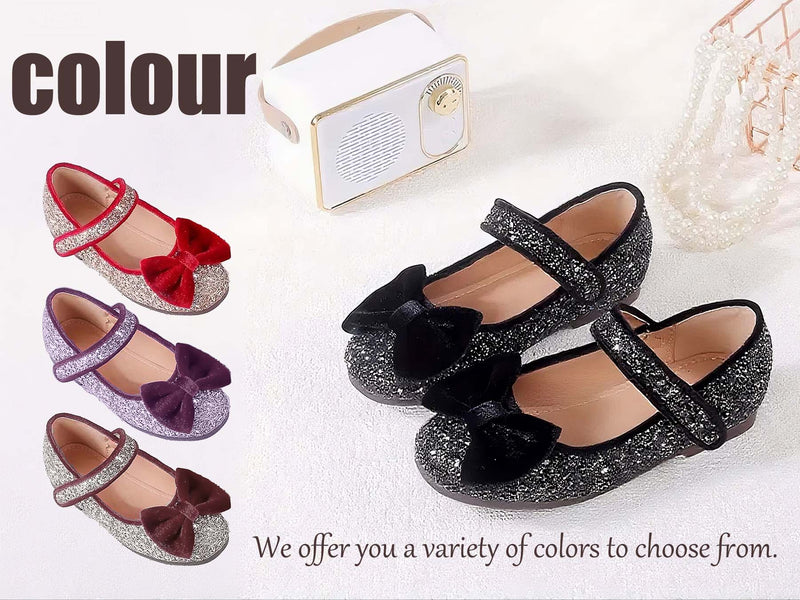 Girls Mary Jane Party Shoes with Sequin Glitter and Velvet Bow – Black Silver Dress Shoes with Buckle Strap for Toddler/Little Kids Birthday, Wedding, Performance