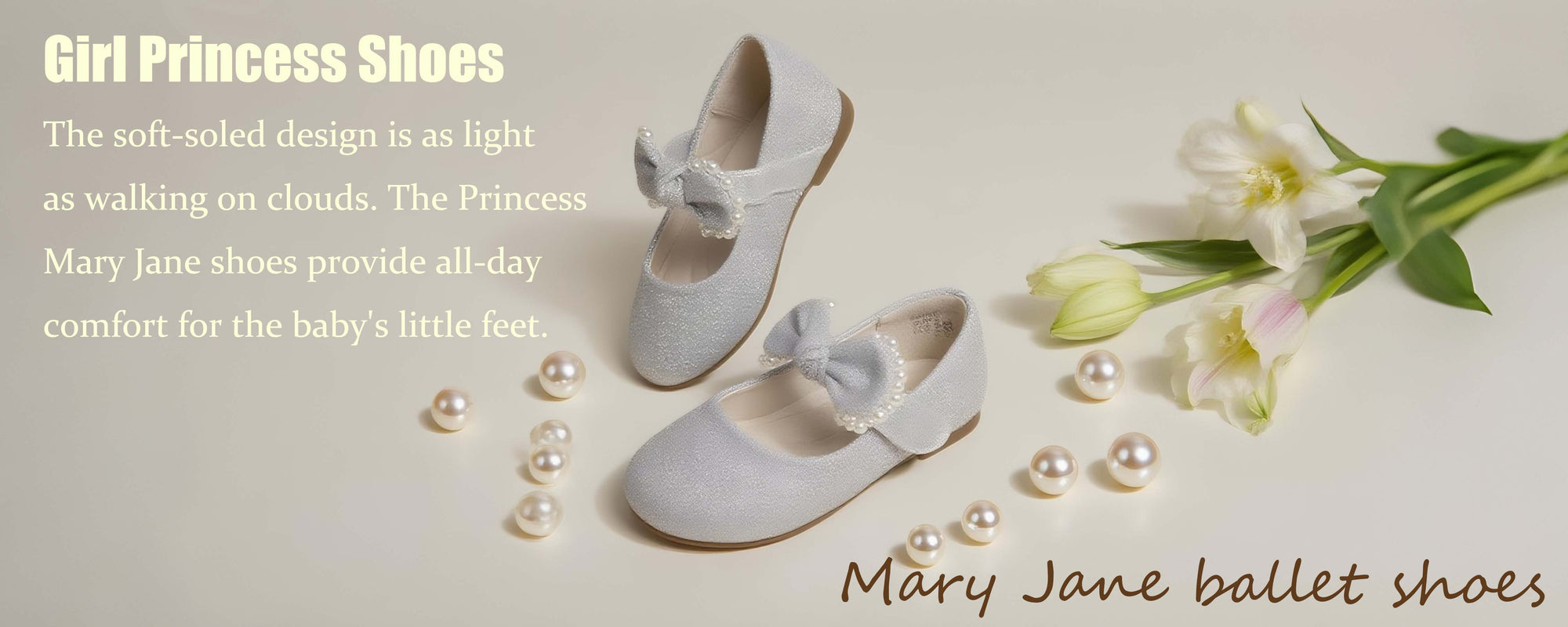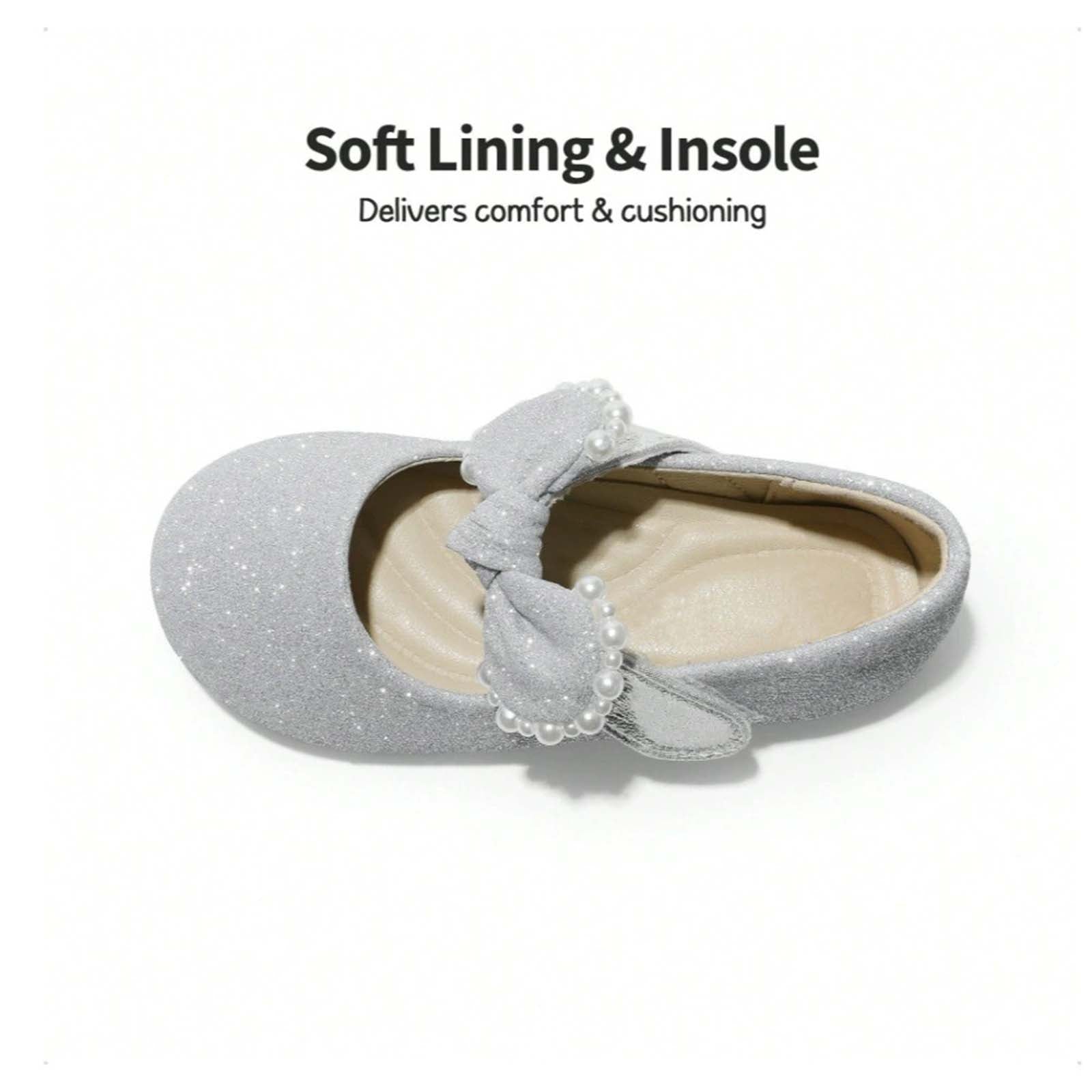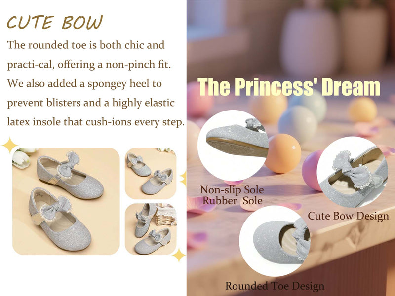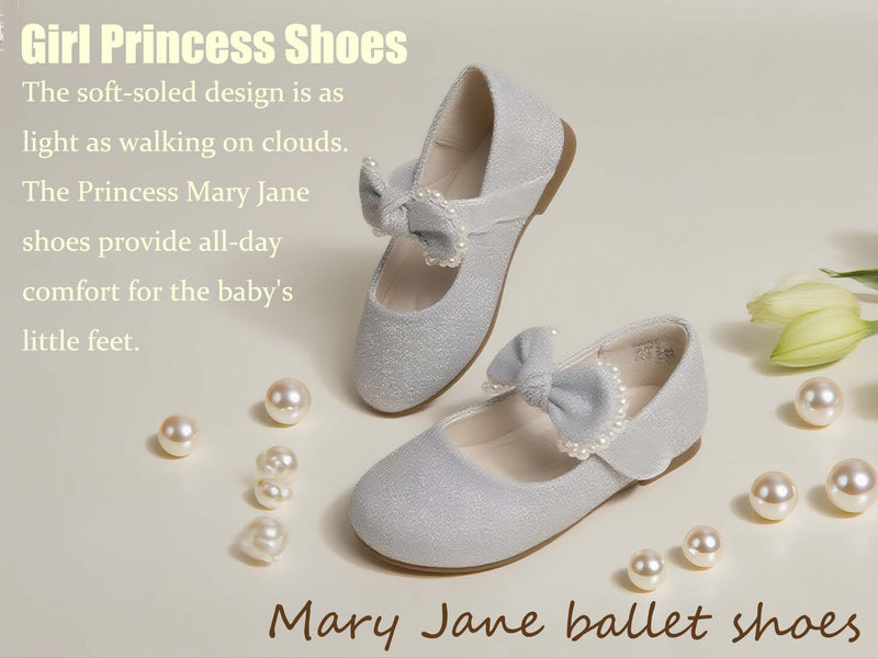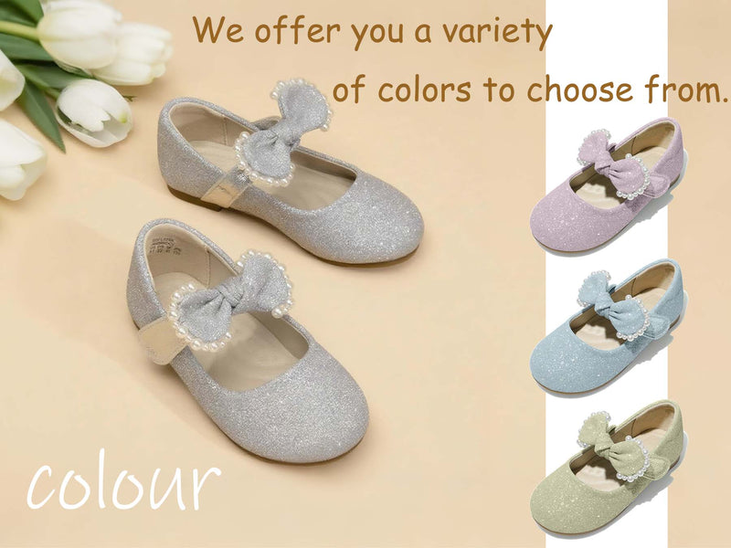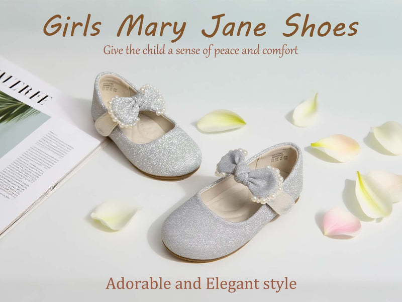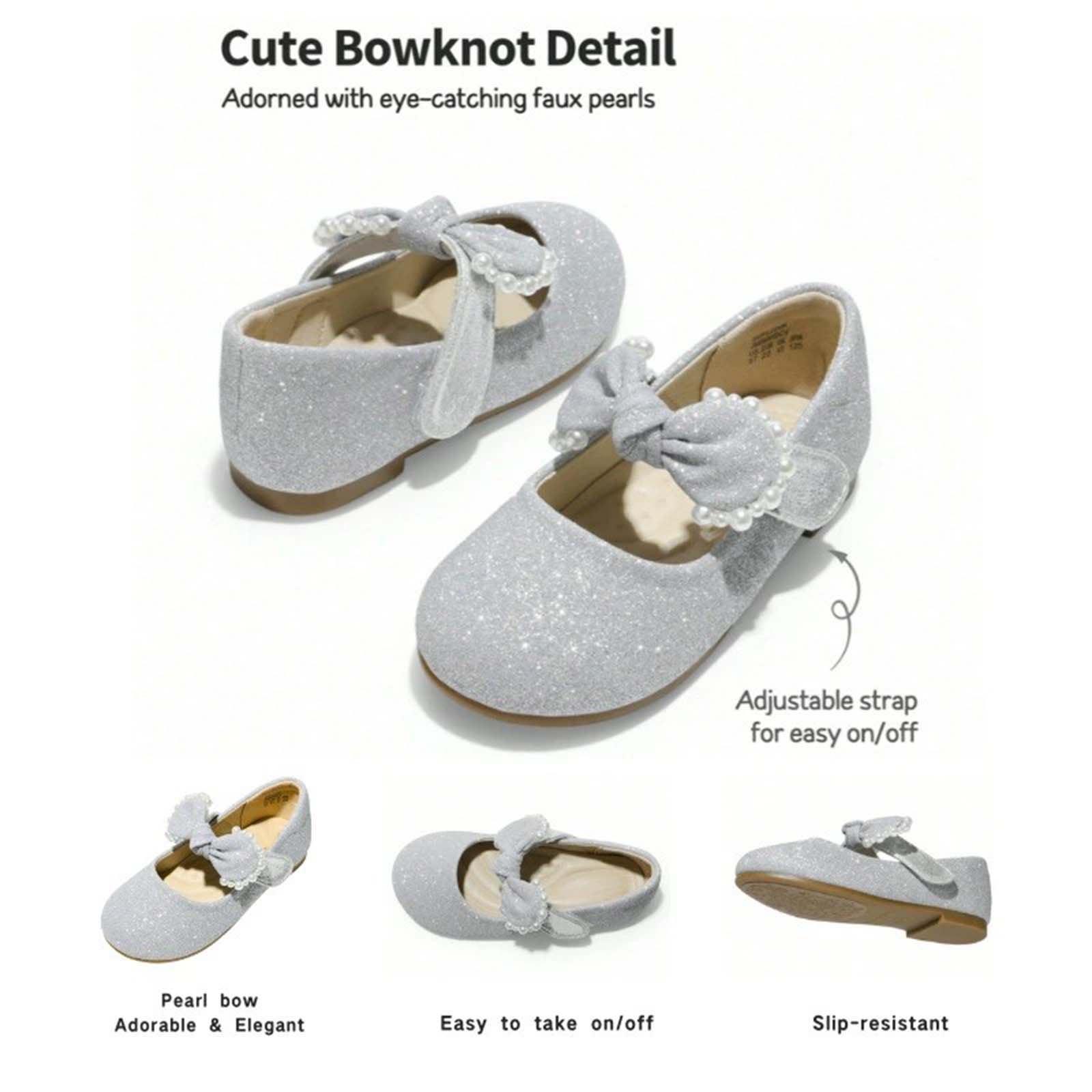 Girls Mary Jane Party Shoes with Glitter Sequins and Pearl Bow – Elegant Silver Gray Dress Shoes with Buckle Strap for Toddler/Little Kids Birthday, Wedding, Performance