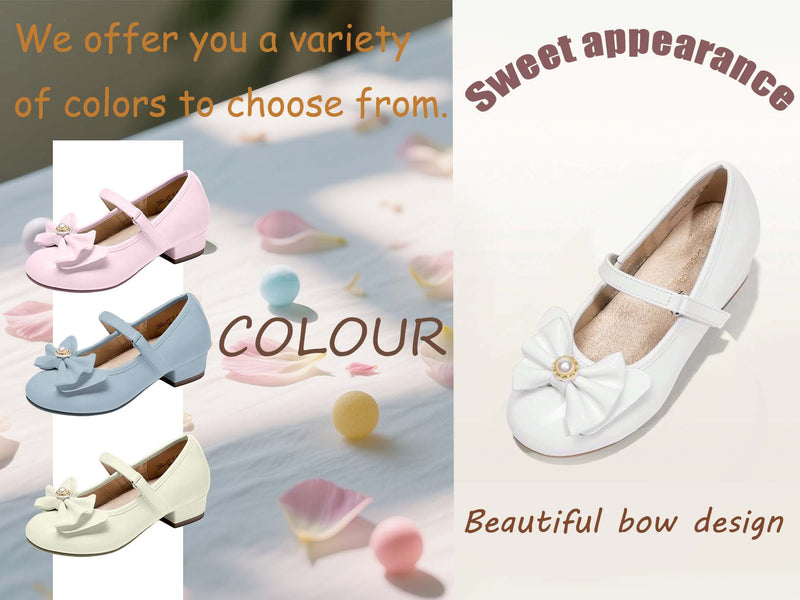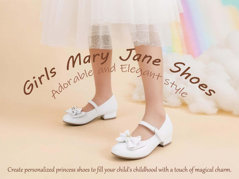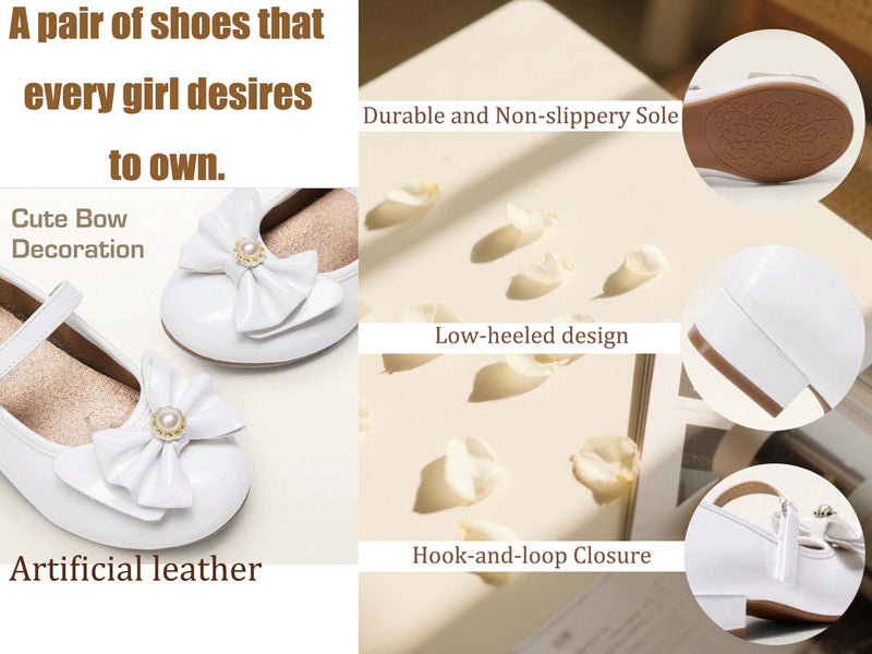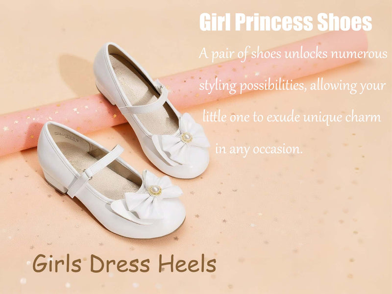Girls Mary Jane Dress Shoes with Low Heels and Pearl Bow – White Leather Toddler/Little Kids Party Wedding Performance Shoes with Buckle Strap