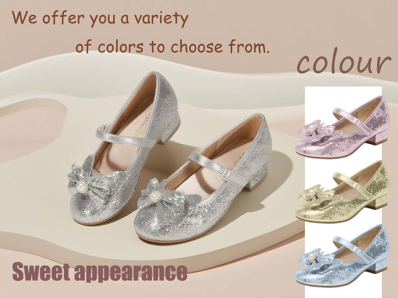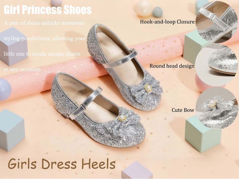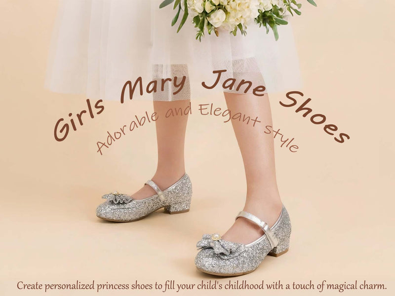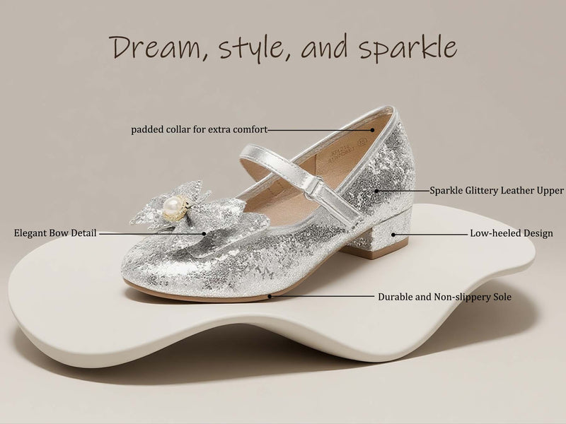 Girls Glitter Mary Jane Dress Shoes with Low Heels and Pearl Bow – Sparkly Silver Party Wedding Performance Shoes with Buckle Strap for Toddler/Little Kids